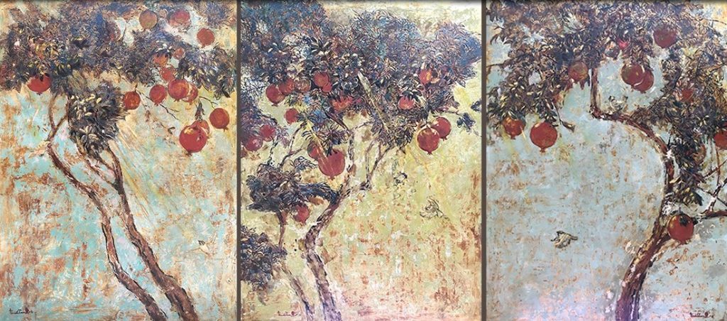 Bức tranh sơn mài về cây lựu mang trong mình vẻ đẹp độc đáo, kết hợp giữa kỹ thuật truyền thống và giá trị thẩm mỹ hiện đại. Với gam màu sâu lắng, phong phú của sơn mài – từ đỏ son, vàng kim đến đen tuyền – cây lựu hiện lên sống động với những chi tiết tinh tế.