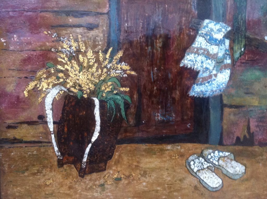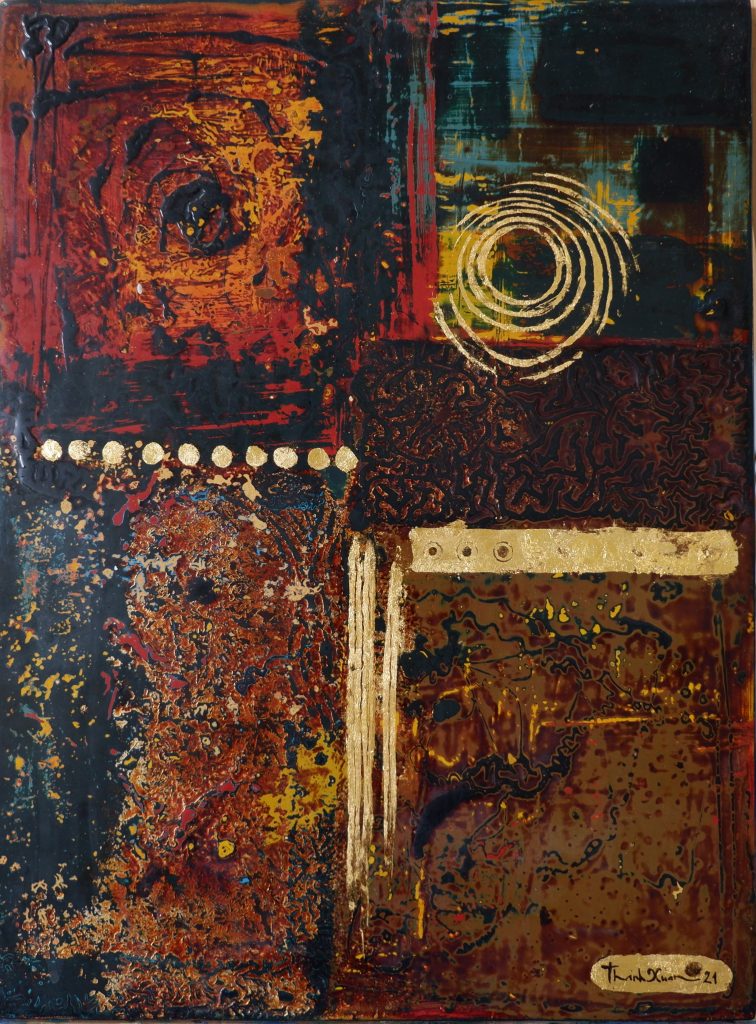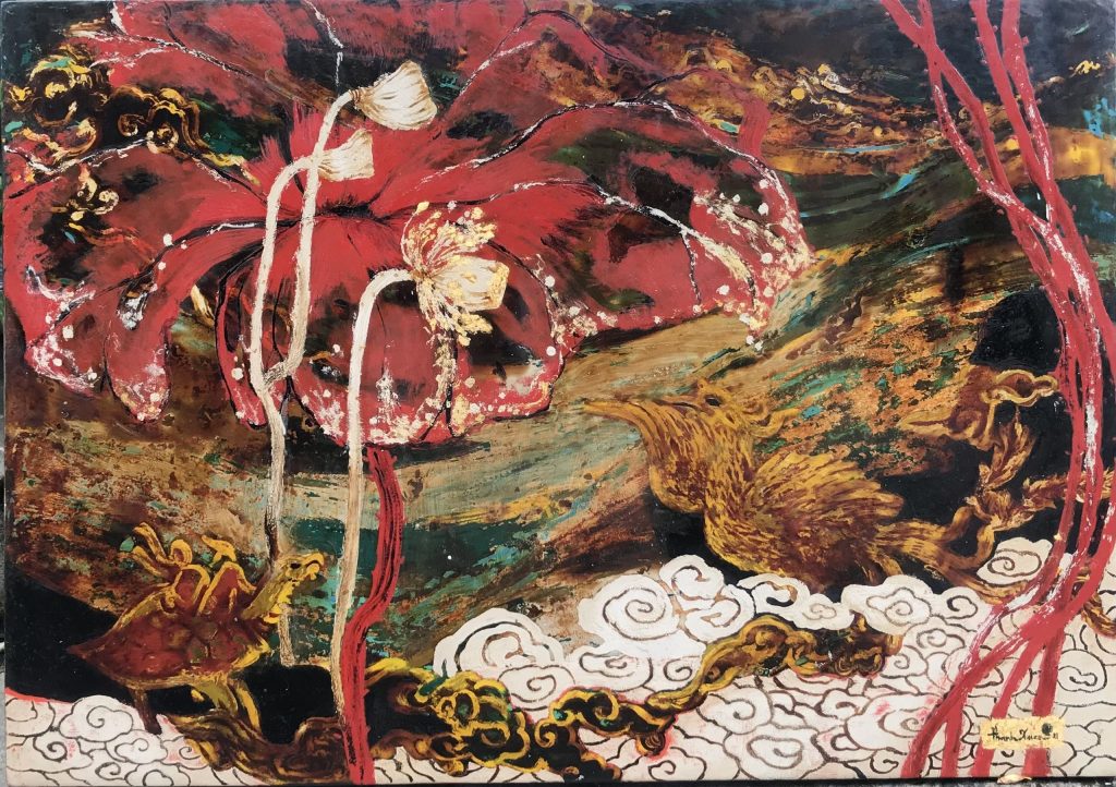 Bức tranh “Một Mình” là một tác phẩm sơn mài đầy cảm xúc, khắc họa hình ảnh bóng lưng một con người bên cạnh chú bò và chú chó – những người bạn đồng hành quen thuộc của cuộc sống thôn quê. Bóng dáng đơn độc, nhỏ bé nhưng đầy sự điềm tĩnh, hòa mình vào không gian rộng lớn, tạo nên cảm giác vừa cô đơn, vừa bình yên.