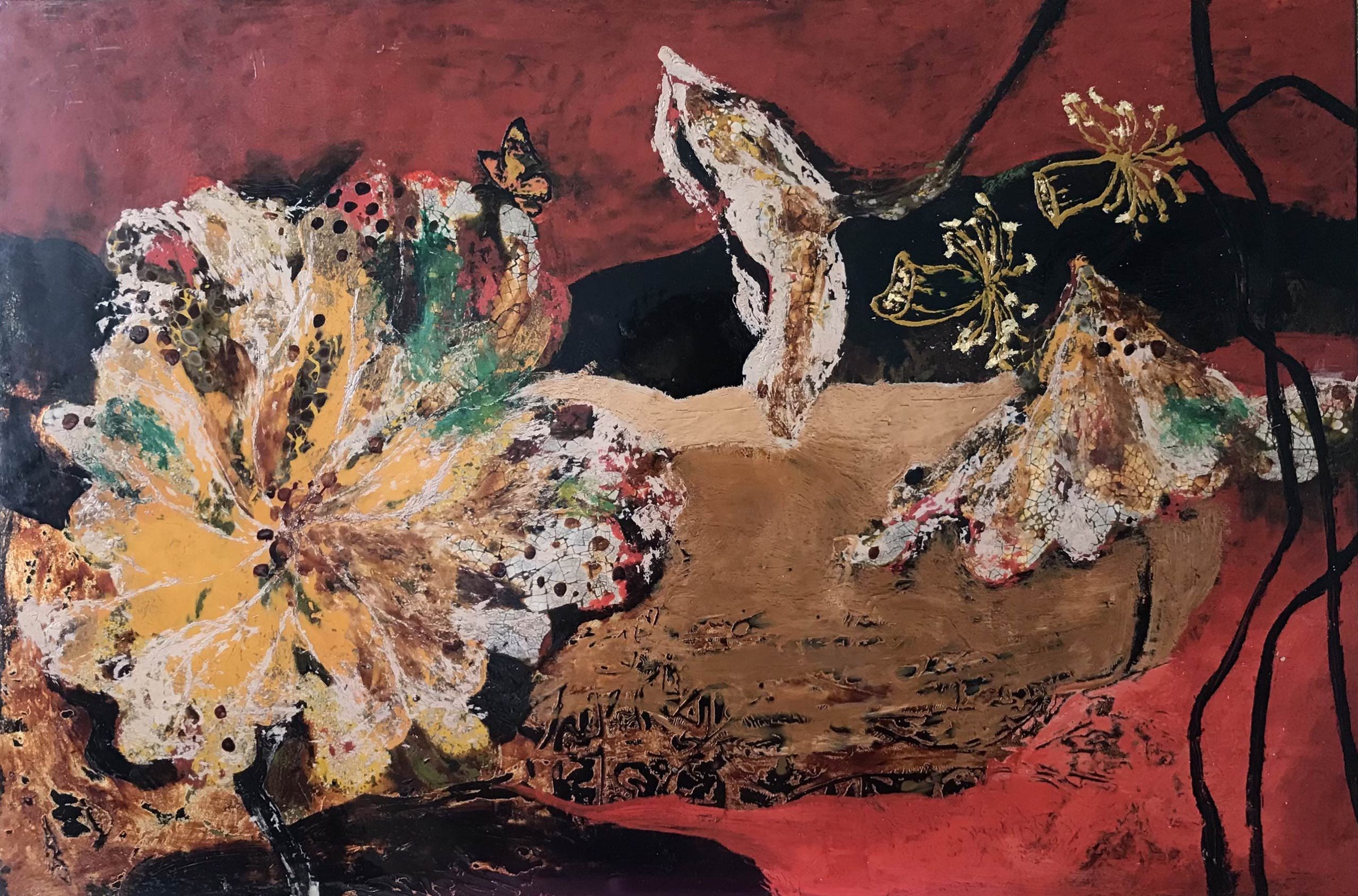 Đây là bức tranh sơn mài mang đậm chất truyền thống, sử dụng các tông màu chủ đạo đỏ, nâu đất và các sắc thái tinh tế của lá sen được cẩn trứng với màu trắng, vàng và đen. Lá sen trong tranh được thể hiện một cách mềm mại, đầy tự nhiên, làm nổi bật sự tĩnh lặng và thanh bình của không gian. Trên lá sen, đài sen xuất hiện với đường nét chắc chắn, tạo điểm nhấn cân đối cho toàn bức tranh. Đặc biệt, hình ảnh một con bướm nhỏ đậu trên lá sen không chỉ mang lại cảm giác sinh động mà còn truyền tải sự thanh thoát, nhẹ nhàng, gợi lên vẻ đẹp của cuộc sống trong sự hài hòa giữa thiên nhiên và nghệ thuật.